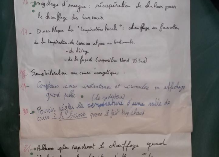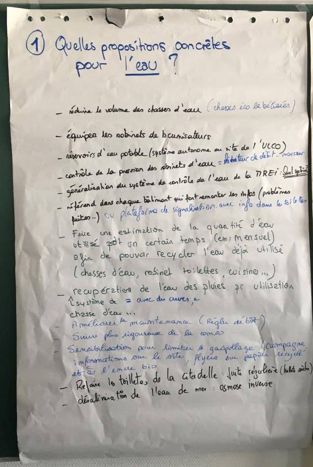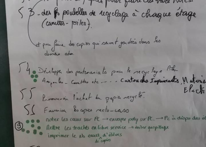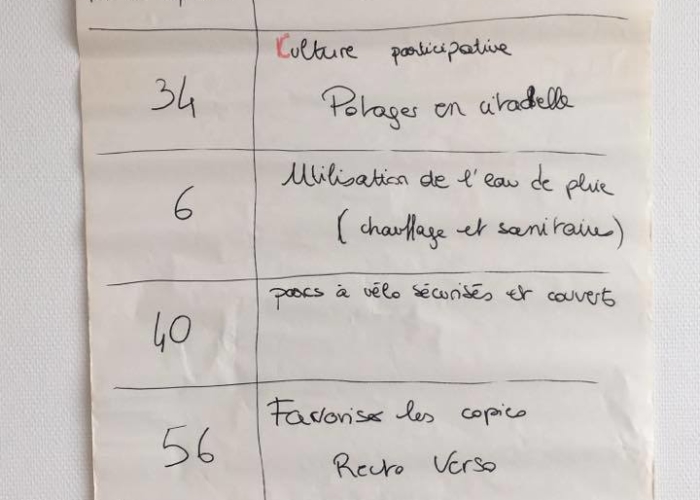Le 6 octobre, 88 propositions ont été regroupées et le 13 octobre, 55 propositions. A l’issue de chaque séance, un vote de priorisation a eu lieu, qui a permis à chacun de cibler les propositions qui lui semblaient prioritaires à mettre en place, étant bien entendu que toutes les propositions étaient intéressantes….5 propositions ont donc été retenues comme prioritaires.