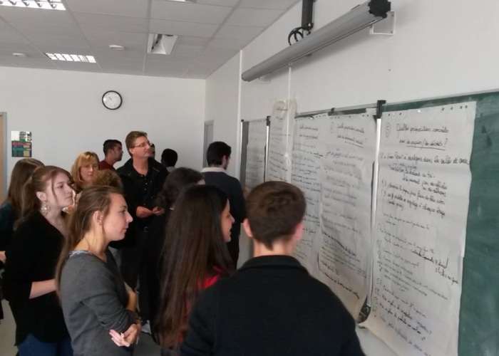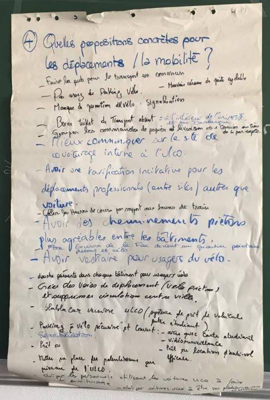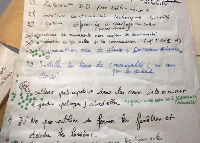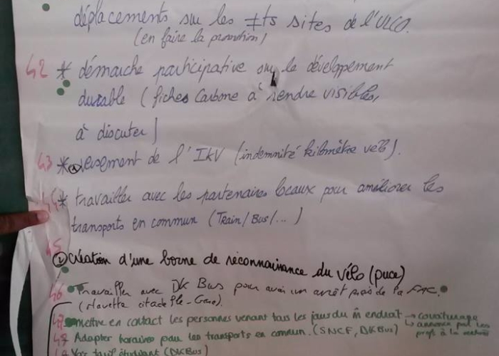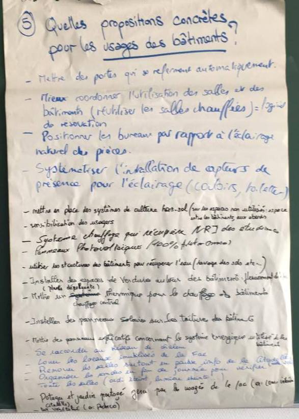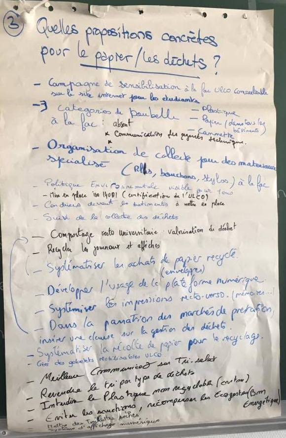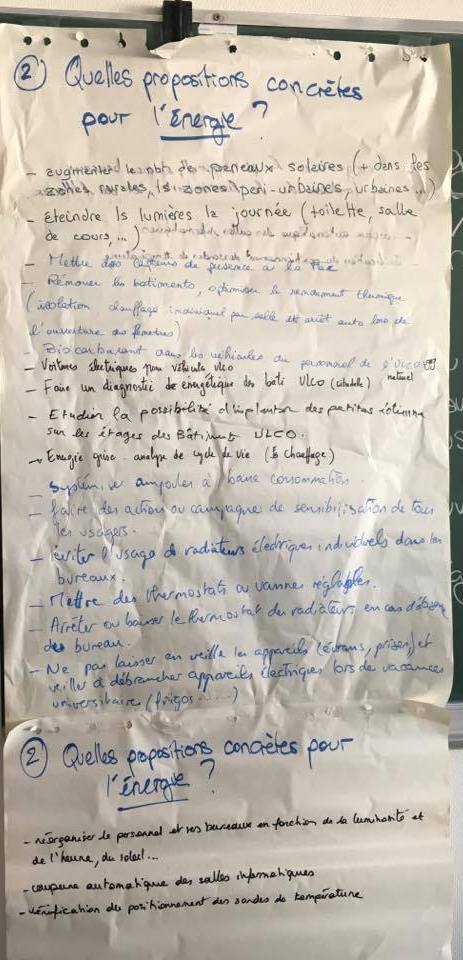Certains d’entre vous ont également participé aux débats qui ont suivi : « cafés urbains ». Les objectifs de cette démarche étaient de sensibiliser les participants au problème d’énergie lié à l’environnement et essayer de trouver des solutions concrètes applicables à l’ULCO. Les participants réunis en groupes de 5, ont proposé des actions concrètes à réaliser en rapport avec 5 thèmes liés à l’énergie, l’eau, les transports, les papiers/déchets, les bâtiments.