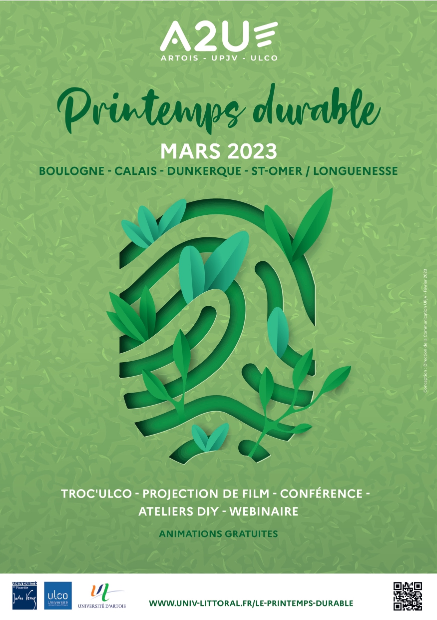 Dans le cadre de l’alliance A2U, l’ULCO, l’Université d’Artois et l’Université de Picardie Jules Verne s’associent afin de vous proposer LE PRINTEMPS DURABLE, une série d’évènements sur la thématique du développement durable, ouverts gratuitement à l’ensemble des personnels et étudiant.e.s des trois universités.
